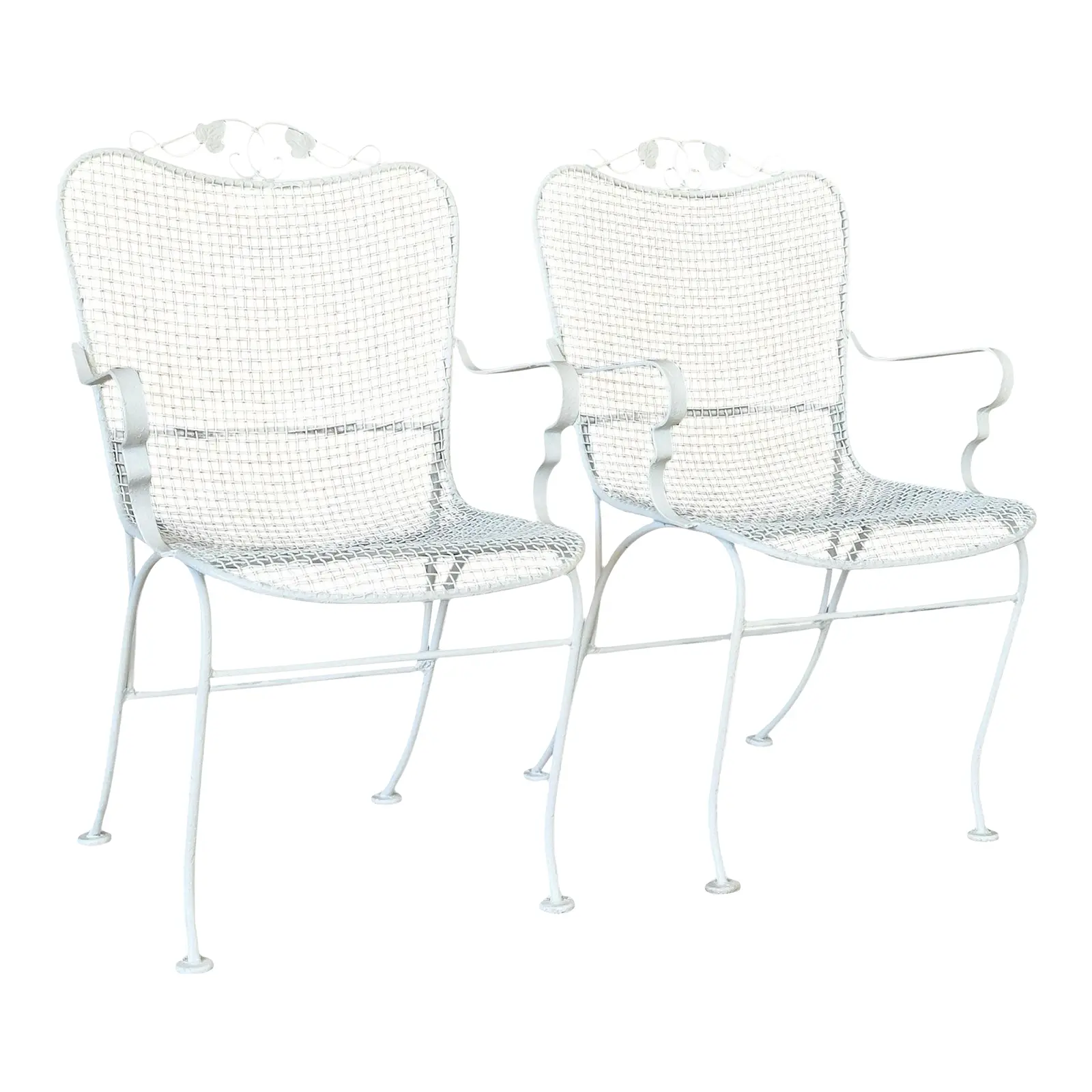 Classic and timeless pair of Mid-20th Century Russell Woodard wrought iron armchairs. Expertly crafted in the iconic mesh design with elegant scrolled arms and decorative grapevine details along the top crest. Painted in a matte white finish, showing light wear consistent with age and use.
