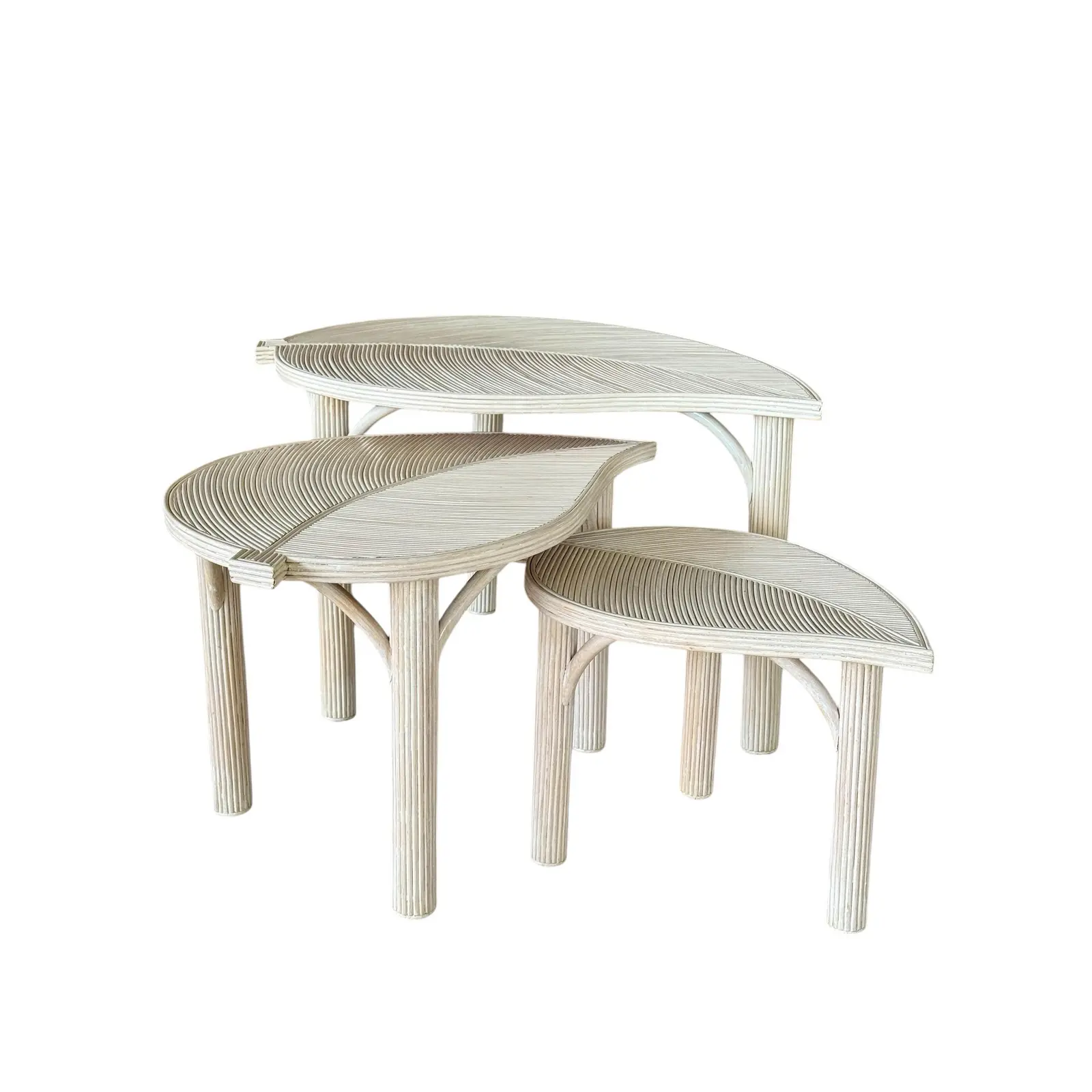 A rare and striking set of three sculptural nesting tables, each designed in the form of a stylized leaf and crafted from pencil rattan. These tables have been thoughtfully restored with a soft whitewashed painted finish to emulate their original look, then sealed with an exterior-grade polyurethane for durability and longevity.